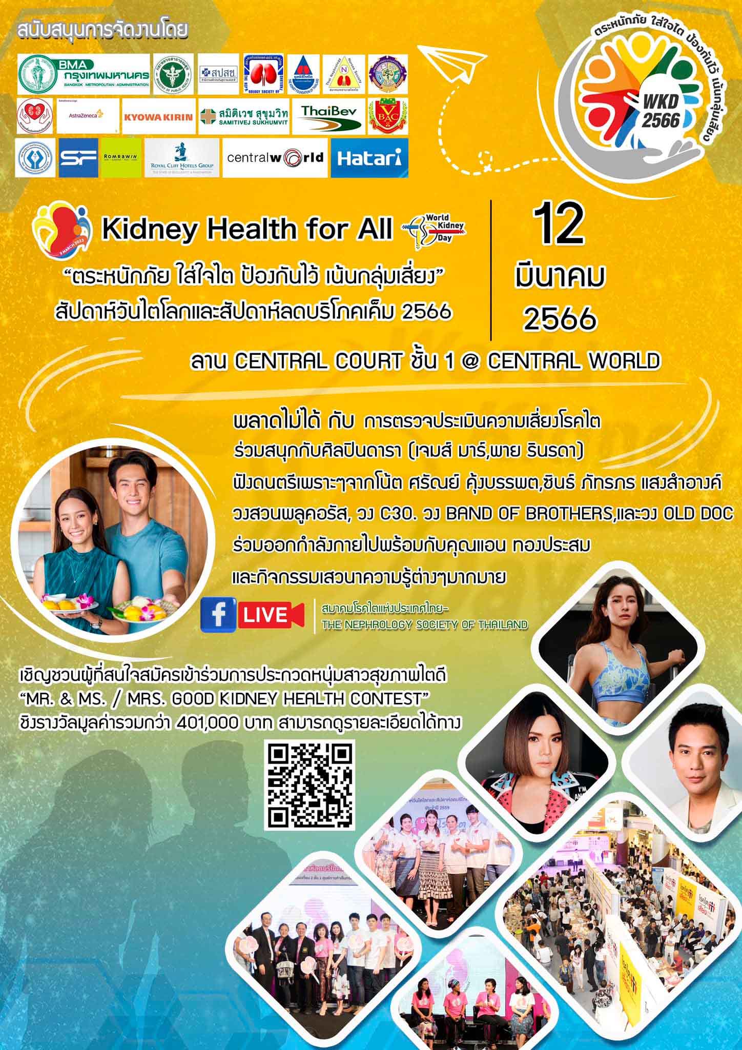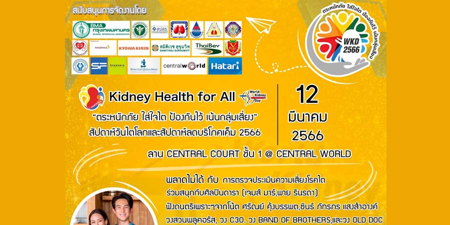 สมาคมโรคไตแห่งประเทศไทย จัดกิจกรรมวันไตโลก ประจำปี 2566 ในวันอาทิตย์ที่ 12 มีนาคม พ.ศ. 2566 เวลา 10:30 – 16:30 น. ณ บริเวณ ชั้น 1 โซน Central Court Zone C (ใกล้ลิฟต์แก้ว) ภายในศูนย์การค้าเซ็นทรัลเวิลด์