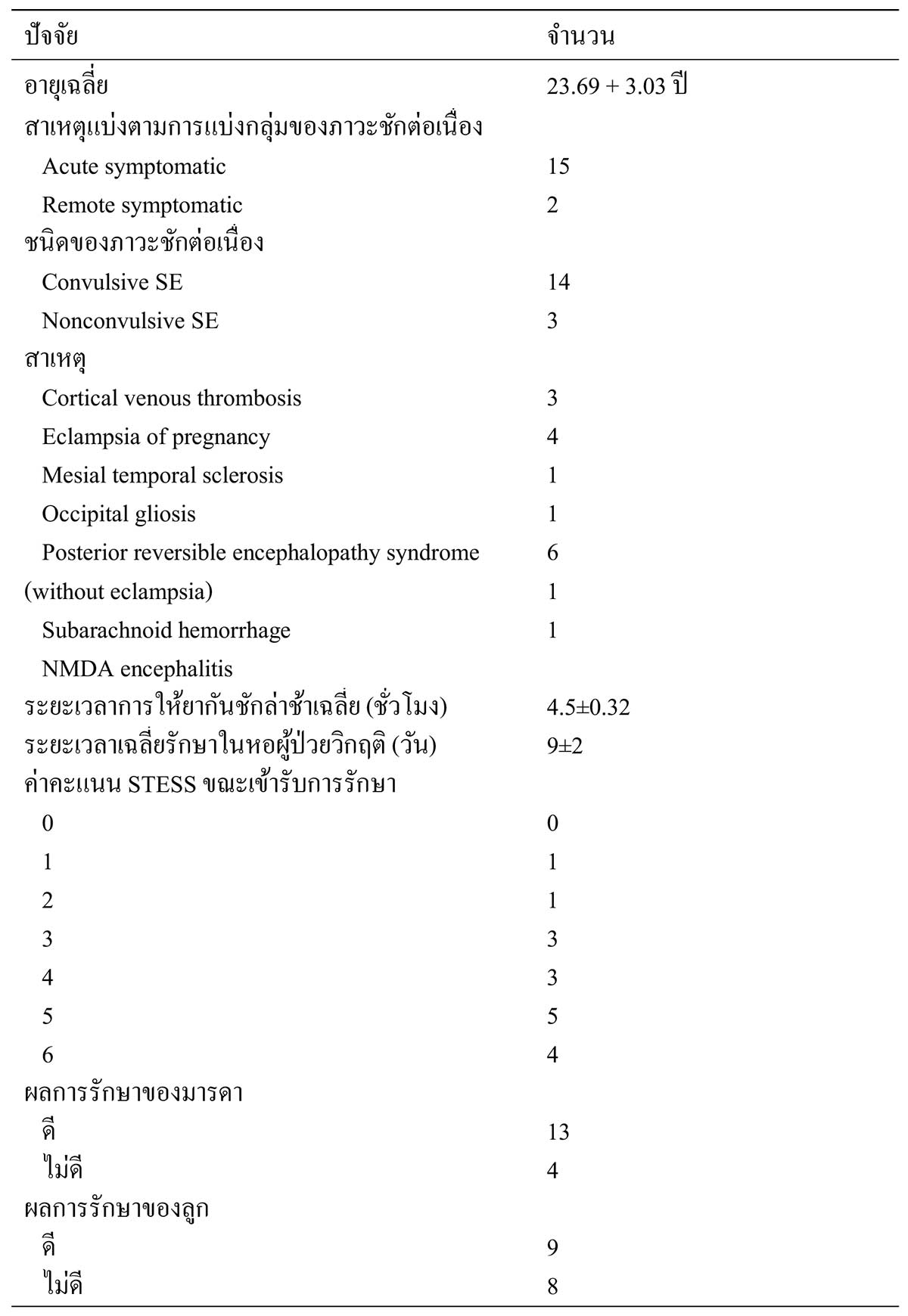 การศึกษาโดย Rajiv KR และคณะ1 ศึกษาในประเทศอินเดียในผู้ป่วยจำนวน 17 ราย พบสาเหตุเกิดจาก posterior reversible encephalopathy syndrome (PRES) บ่อยที่สุด รายละเอียดดังตารางที่ 1 รูปแบบการชักเป็นแบบ convulsive status epilepticus (CSE) 14 ราย และ non-convulsive status epilepticus (NCSE) 3 ราย ผลการรักษาของมารดา ประเมินโดย functional independence measure (FIM) รายละเอียด ดังตารางที่ 2 และ modified Rankin Scale (mRS) รายละเอียด ดังตารางที่ 3 ความรุนแรงของภาวะชักต่อเนื่องประเมินโดย STESS (Status Epilepticus Severity Score) ดังตารางที่ 4 ซึ่งผู้ป่วยจะได้รับการประเมินช่วงเวลากลับบ้าน โดยแบ่งเป็น good outcome (FIM score 4-7, mRS 0-2) และ poor outcome (FIM score 1-3, mRS >3) ส่วนทารกประเมินหลังคลอด โดยกลุ่มที่ 1 ได้แก่ คลอดปกติไม่มีภาวะแทนกซ้อน กลุ่มที่ 2 เสียชีวิต หรือต้องเข้ารับการรักษาใน neonatal intensive care unit เนื่องจากมีภาวะแทรกซ้อน