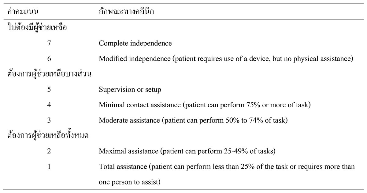ตารางที่ 2 การประเมิน functional independence measure (FIM) outcome score