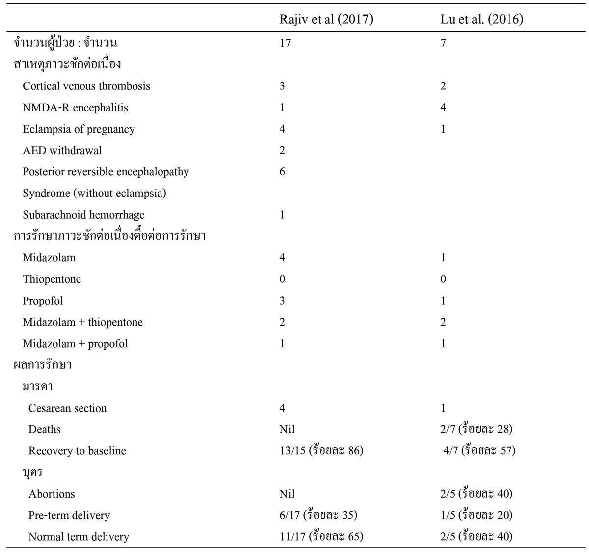 ก่อนหน้านี้มีการรายงานผลการศึกษาภาวะชักต่อเนื่องในสตรีตั้งครรภ์ โดย Lu YT และคณะ5 ผู้ป่วยจำนวน 7 ราย รายละเอียด ดังแสดงในตารางที่ 5