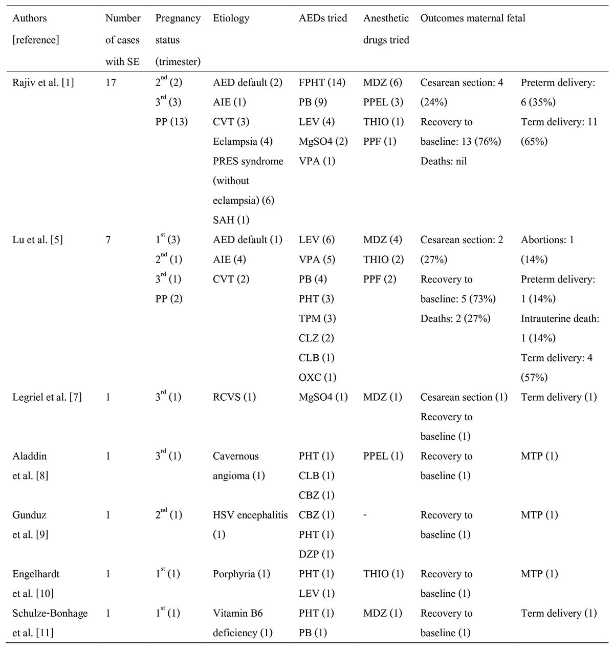 การศึกษาล่าสุดที่ได้รวบรวมผู้ป่วยภาวะชักต่อเนื่องในสตรีตั้งครรภ์ โดยรวบรวมผลการศึกษาทั้งหมดที่มีรายงานในปัจจุบัน สรุปรายละเอียดดังตารางที่ 6