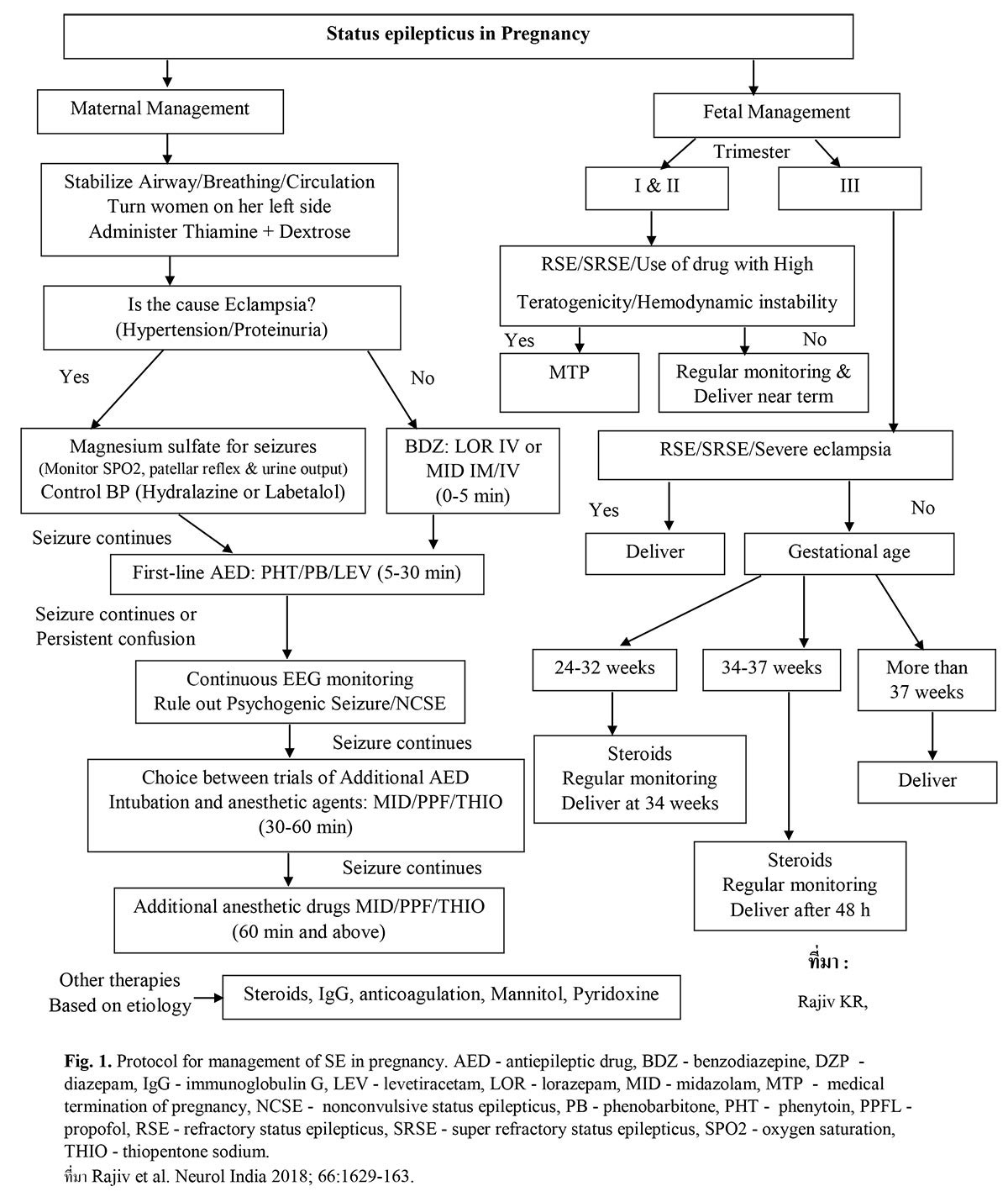 ที่มา : Rajiv KR, Radhakrishnan A. Status epilepticus in pregnancy – Can we frame a uniform treatment protocol? Epilepsy & Behavior 2019;101:106376.