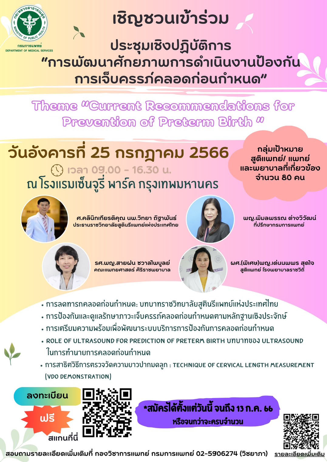 กองวิชาการแพทย์ กรมการแพทย์ จัดการประชุมเชิงปฏิบัติการ “ การพัฒนาศักยภาพการดำเนินงานป้องกัน การเจ็บครรภ์คลอดก่อนกำหนด ” Theme “ Current Recommendations for Prevention of Preterm Birth ” วันอังคารที่ 25 กรกฎาคม 2566 เวลา 09.00 – 16.30 น. ณ โรงแรมเซ็นจูรี่ พาร์ค กรุงเทพฯ