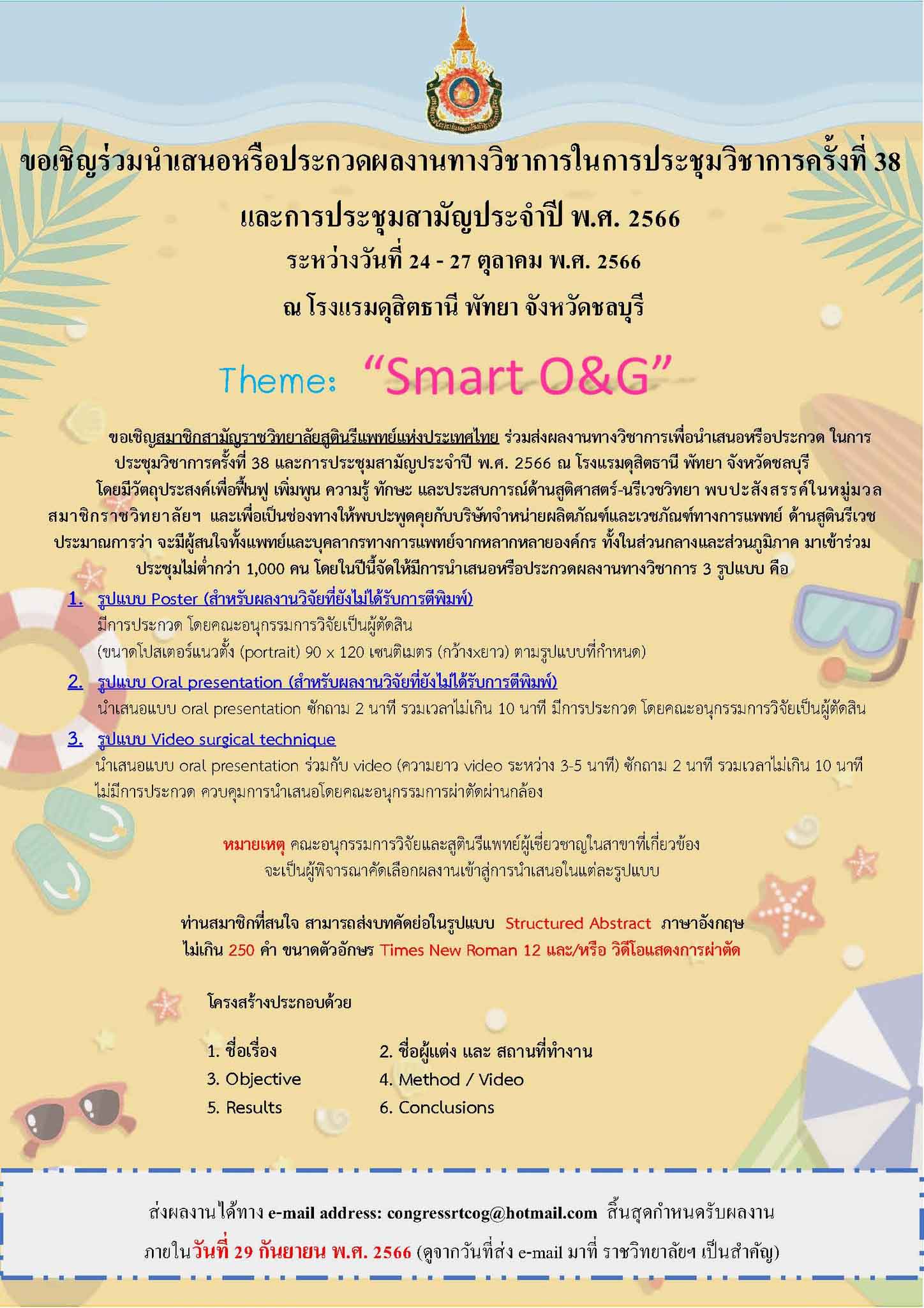 ขอเชิญสมาชิกสามัญราชวิทยาลัยสูตินรีแพทย์แห่งประเทศไทย ร่วมส่งผลงานวิจัยเพื่อนําเสนอหรือประกวด ในการประชุมวิชาการครั้งที่ 38 และการประชุมสามัญประจำปี พ.ศ. 2566 ณ โรงแรมดุสิตธานี พัทยา จังหวัดชลบุรี
